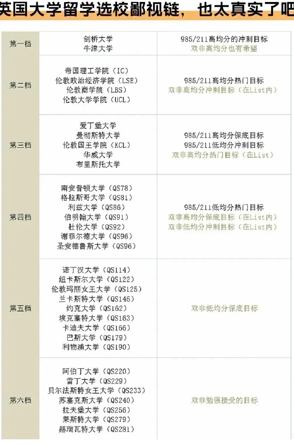 所以,英国大学选校也有鄙视链,非常现实。既有学业分数鄙视链,也有就读本科背景鄙视链。