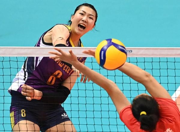 ️天津队球员袁心玥(上)在比赛中扣球。新华社记者 颜麟蕴 摄