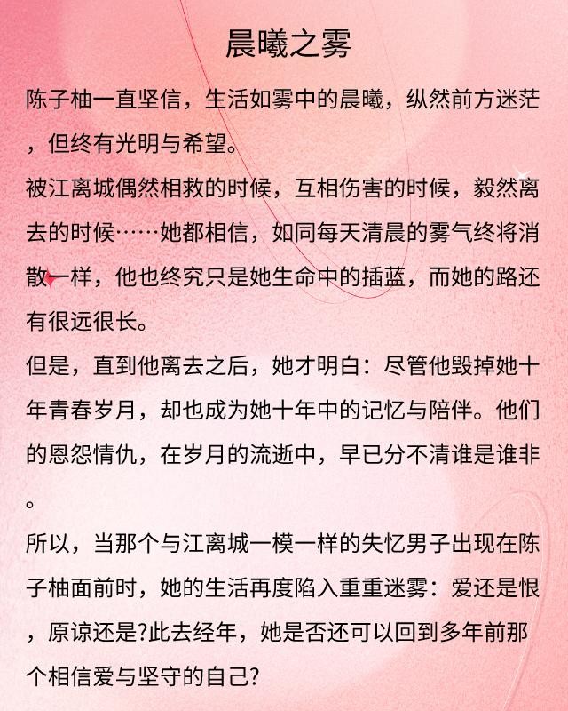 这故事有种上一辈的恩怨,由这一辈的儿女偿还的感觉,对于江离城,陈子柚是既爱又恨。当江离城被宣布死亡时,她才知道自己的内心最真实想法。
