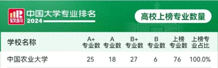 今天(6月13日),高等教育专业评价机构软科正式发布“2024软科中国大学专业排名”。排名结果显示,中国农业大学共有76个专业上榜,上榜专业占比100.0%;25个专业获评A+,较去年增加5个。值得一提的是,学校15个专业位居全国第一。