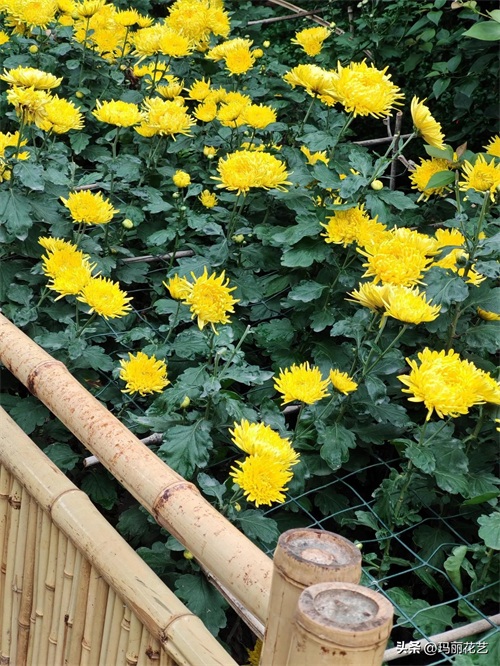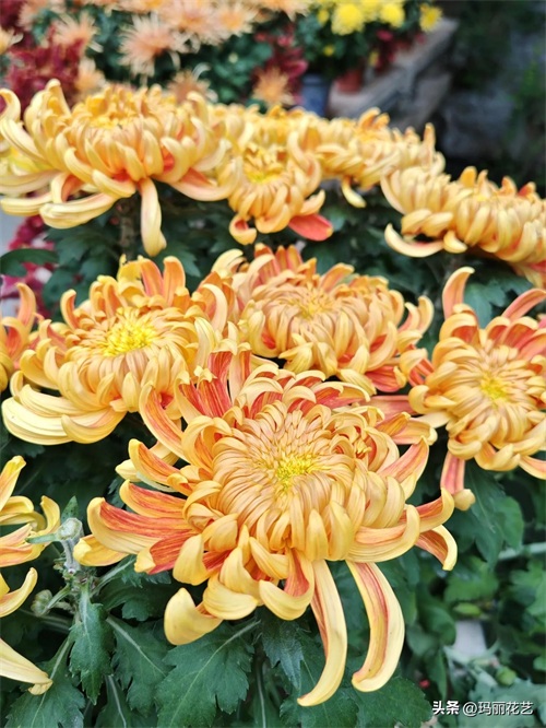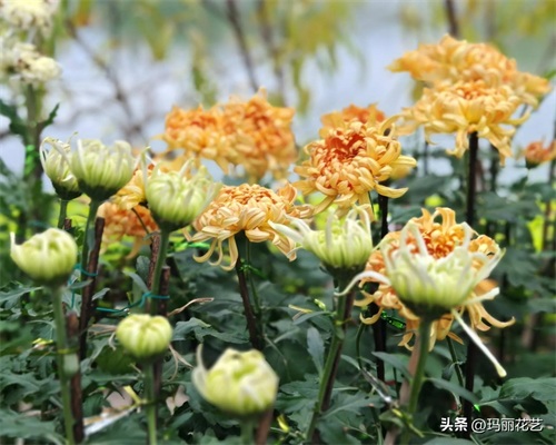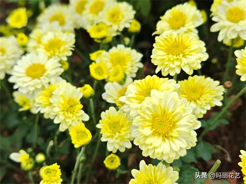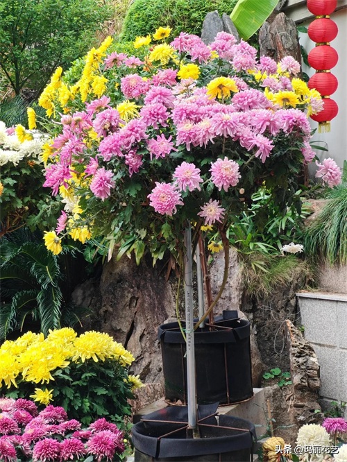 大立菊:一株菊花(一个主杆直上分枝成形)开花百千朵,花朵大小相仿,花期同在。