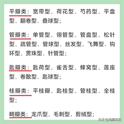 平瓣类,管瓣类,匙瓣类,桂瓣类,畸瓣类。