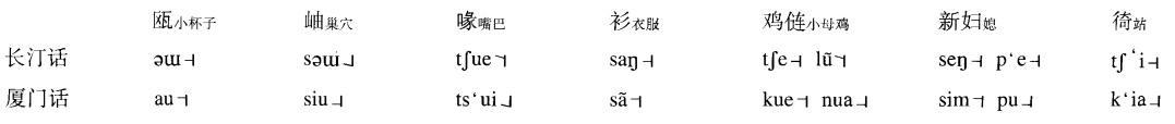 从早期客家与闽人先民在中原的居住地没有什么差别,两个民系从中原南迁的过程也大致相似来看,因此客家先民当时所带来的中原汉语与闽人所带来的中原汉语,虽然可能存在着方言的某些差异,但是也应该有许多的共同点。再看客家话与闽语,在语音和词汇上,确实有不少共同的地方。先说语音,声母方面,古非组字,客家话与闽语都有读重唇声母【p-p'-】的。如"放"长汀读【pion1】,闽语的厦门读【paŋ】。韵母方面,梅县保留着中古【-m -n -ŋ】三套鼻音韵尾和【-p -t -k】三套入声韵尾,这又与闽语的闽南话一样。声调方面,保留入声声调,且根据古清浊声母分入声为阴阳两个调类,这跟闽语的多数方言一致。词语方面,有不少基本词语,客家话与闽语也是相同的。下面以客家的长汀话与闽南的厦门话为例。