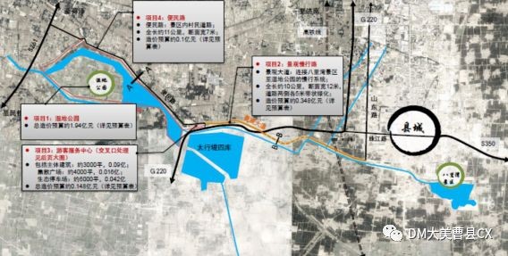 曹县黄河故道国家生态湿地公园位于城区西邻的黄河故道滩涂上,湿地以太行堤水库为依托,由引黄干线、太行堤水库堤坝围合而成,规划面积887.6公顷,其中湿地面积858.7公顷,湿地率96.7%。整个湿地规划建设了科普宣教区、合理利用区、恢复重建区、生态保育区、管理服务区、规划预留区等6大功能区,融合“生态+文化+休闲+特色产业” 四重维度的综合开发。