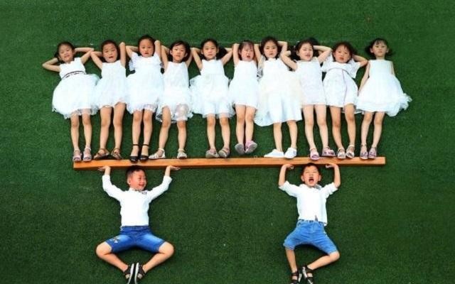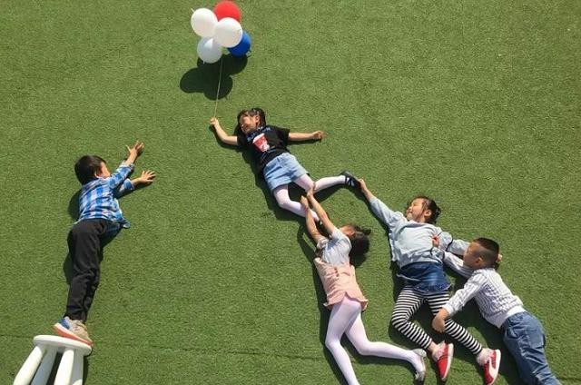 在第一张图片中,一群幼儿园的孩子同时躺在了草地上,两个男生同时举着一根长长的木板,木板上面是一群小女孩。看起来就像是两个男生举着一群小公主一样。