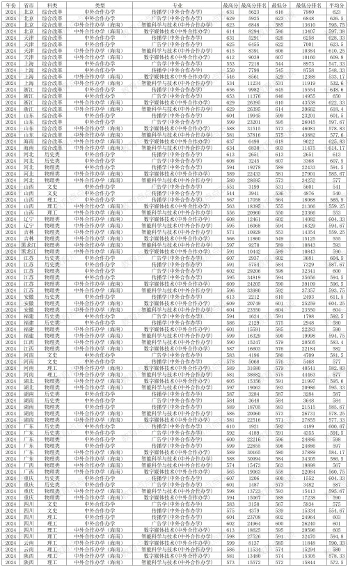 八、中国传媒大学2024年中外合作办学在各省各专业录取分数线