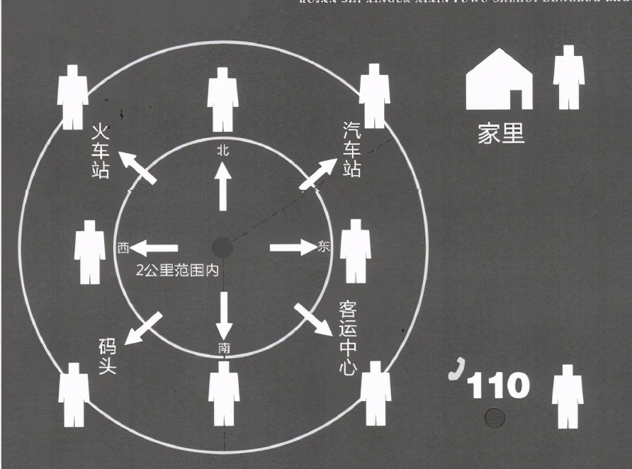 2、搜寻分粗细两层,首先以孩子走失地点为中心扩散2公里以内,每个方向安排1个人,沿着大马路寻找。
