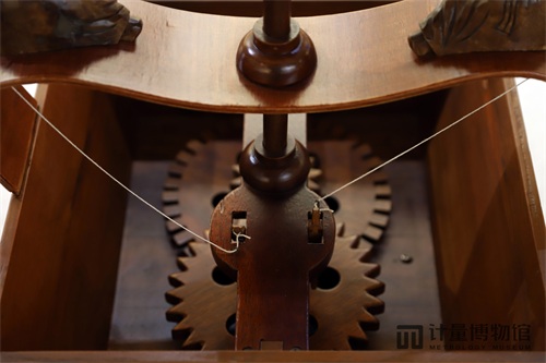 记里鼓车利用齿轮传动来计算距离,每走一里便击鼓一次,这与今天汽车里程表每行1公里,便在显示屏上显示1个里程数值相同。并且车中有一套减速齿轮系,始终与车轮同时转动,其最末一只齿轮轴在车行一里时正好回转一周,车子上层的木人受凸轮牵动,由绳索拉起木人右臂击鼓一次,以示里程。由此可见,记里鼓车其实是近代里程表和减速装置的先驱。