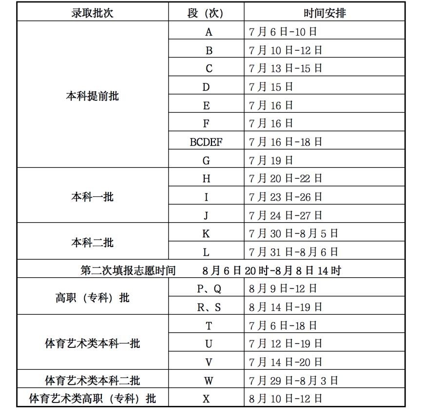 (T段、U段、V段),体育、艺术类本科二批(W段),体育、艺术类高职(专科)批(X段)。