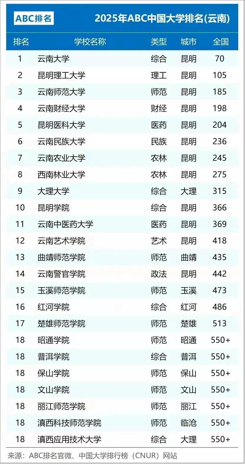2025年ABC中国大学排名(云南版)榜单由ABC排名与CNUR联合发布,云南大学以全国第70名蝉联省内榜首,昆明理工大学(105名)、云南师范大学(185名)、云南财经大学(198名)、昆明医科大学(204名)分列第二至第五。这份基于学科实力、科研产出与社会服务的排名,揭示了云南高校在区域竞争中的新格局。