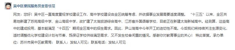 吴中区一直高度重视学校建设工作,高中学校建设由全区统筹考虑,并依据事业发展需要适度调整。 “十三五”以来,全区共易地新建了苏苑高级中学、金山高级中学,改扩建了太湖旅游综合高中、江苏省外国语等学校,目前正在新建太湖新城高中。经测算,这些高中的建成投用,基本能满足“十四五”期间全区高中的招生需求。因此,尹山湖高中今年开工的迫切性不高。今后我们将持续关注生源变化,适时调整优化学校建设计划与节奏,既保证学校供给满足需求,又不发生校舍闲置的情况。感谢你对教育事业的关心!