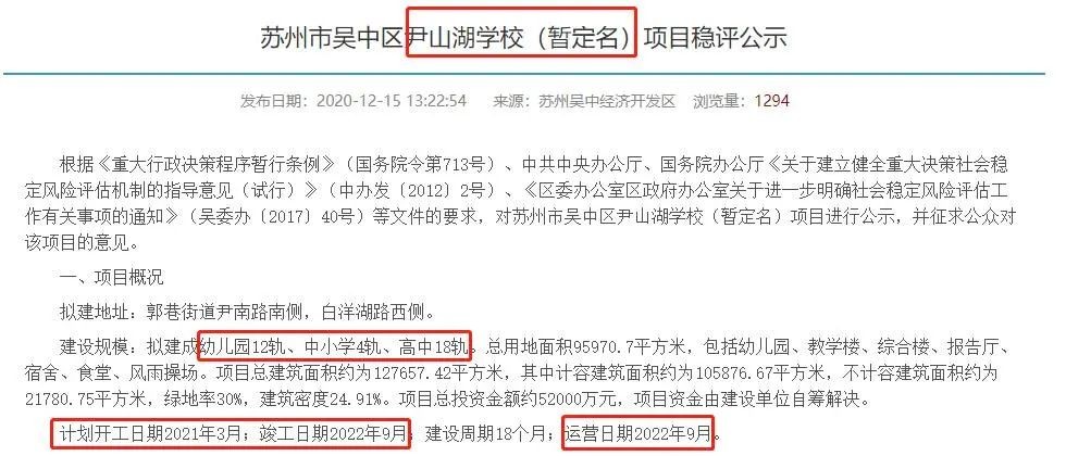 到2020年12月项目稳评公示,但是名字从尹山湖高中变成了尹山湖学校,明确拟建幼儿园、小学、初中、高中15年制学校。