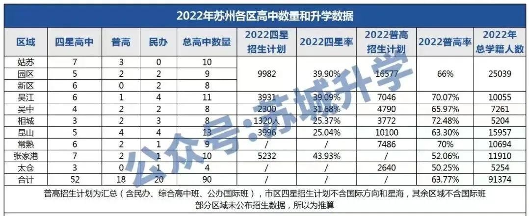 而2022年吴中区中考人数为7261人,普高招生计划4790人,四星高中招生计划2300人,普高率为65.97%,四星率为31.68%。