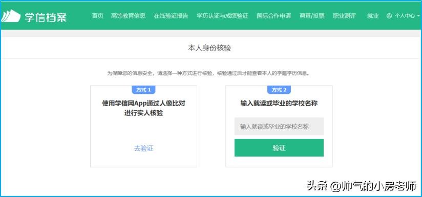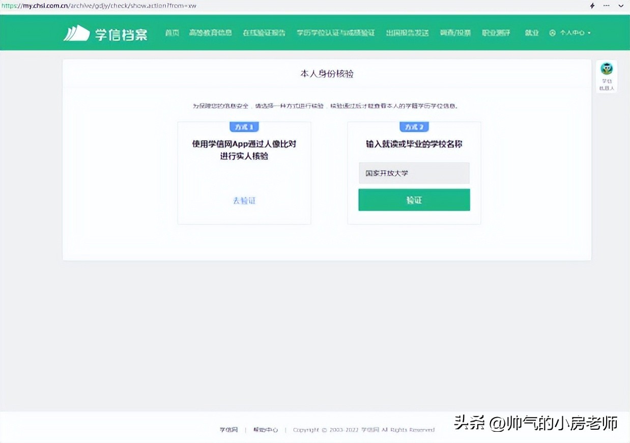 方式 2:通过输入学校名称“国家开放大学”进行核验。如输入不了院校名称,可使用“方式1”验证通过后也可查询本人学籍学历信息。