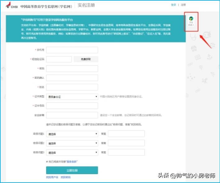 注意:如在注册信息时遇到:填写证件号码后提示证件号码已被注册的问题;重新注册;填写手机号码时提示已被注册的问题;如何修改学信网账号中的手机号码......等技术问题,请点击上图中“学信机器人”位置,相关问题系统均有解答。