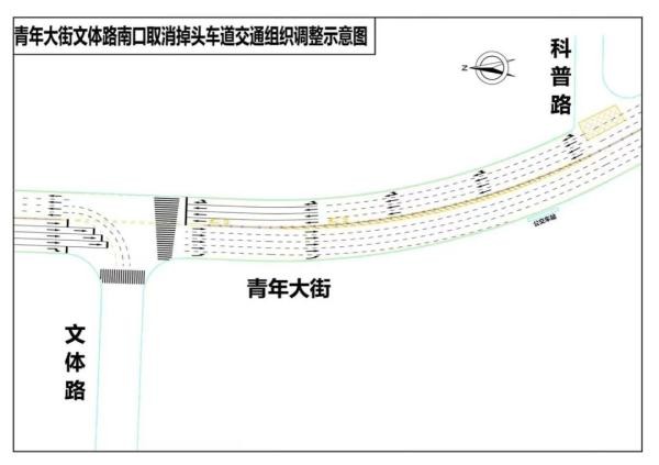 取消青年大街文体路口南口边道的调头点后,将对整个路口车道进行重新分配和渠化,路口北向南5车道,南向北4车道,保障车辆通过路口的行驶轨迹为直线,实现车辆快速顺畅通行,提高路口通行能力。