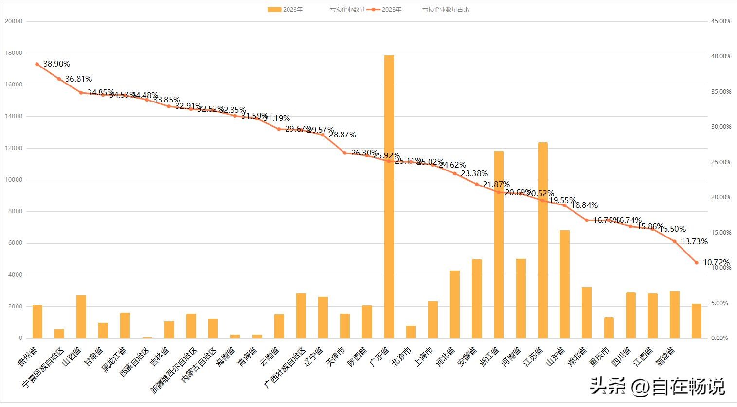 全国上看,亏损企业占比最高的是贵州38.9%、宁夏36.81%、山西34.85%;占比最低的是湖南省10.72%、福建省13.73%、江西省15.5%。