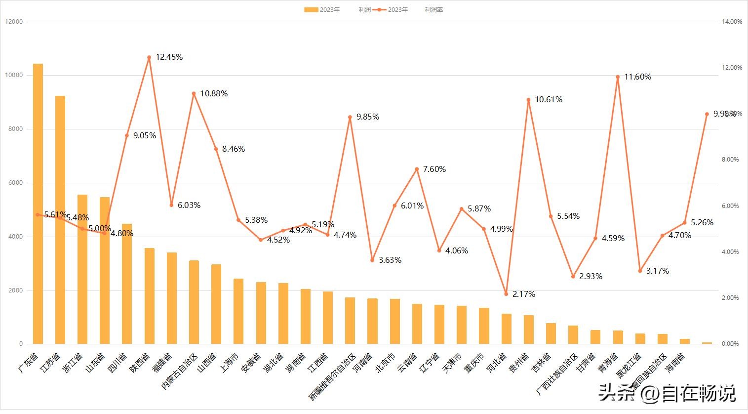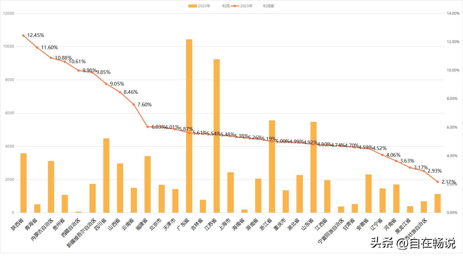 利润率最高的省份是陕西省,利润率高达12.45%,青海省11.6%,内蒙10.88%,贵州10.61%。