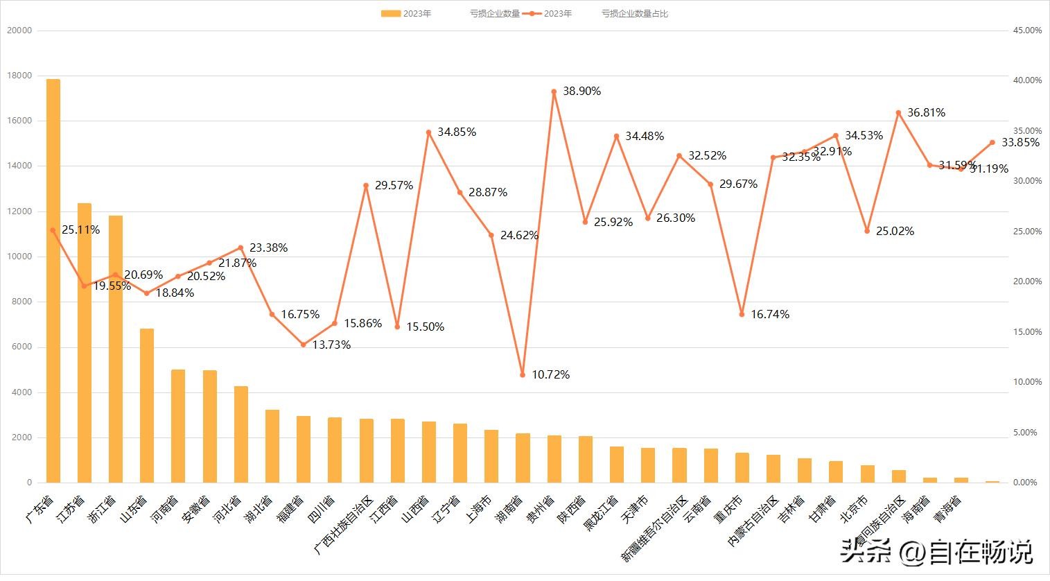 亏损企业数量(下图),广东达到17827家,达到总量的25.11%,前四名中亏损企业数量占比最高。