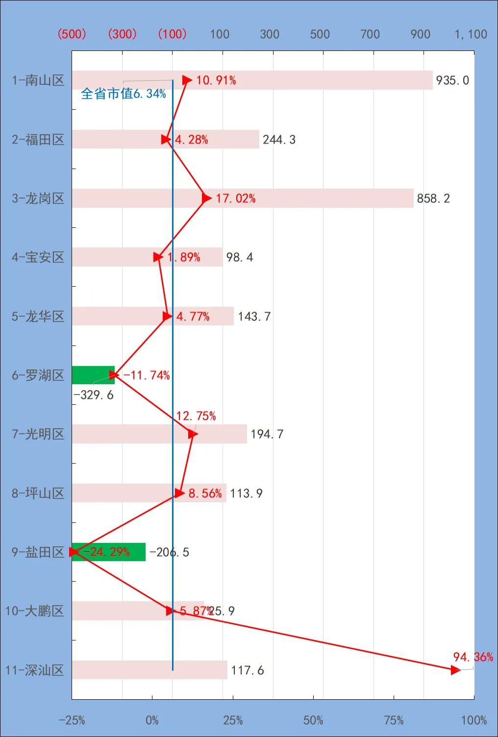 另外,南山、光明两区增势也十分出众,增速双双突破10%,分别为10.91%、12.57%。尤其是南山区,体量大发展又快,增量高达935亿。