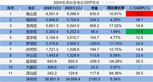 盐田暴跌深汕翻番,南山人均突破50万!2024年深圳各区GDP出炉