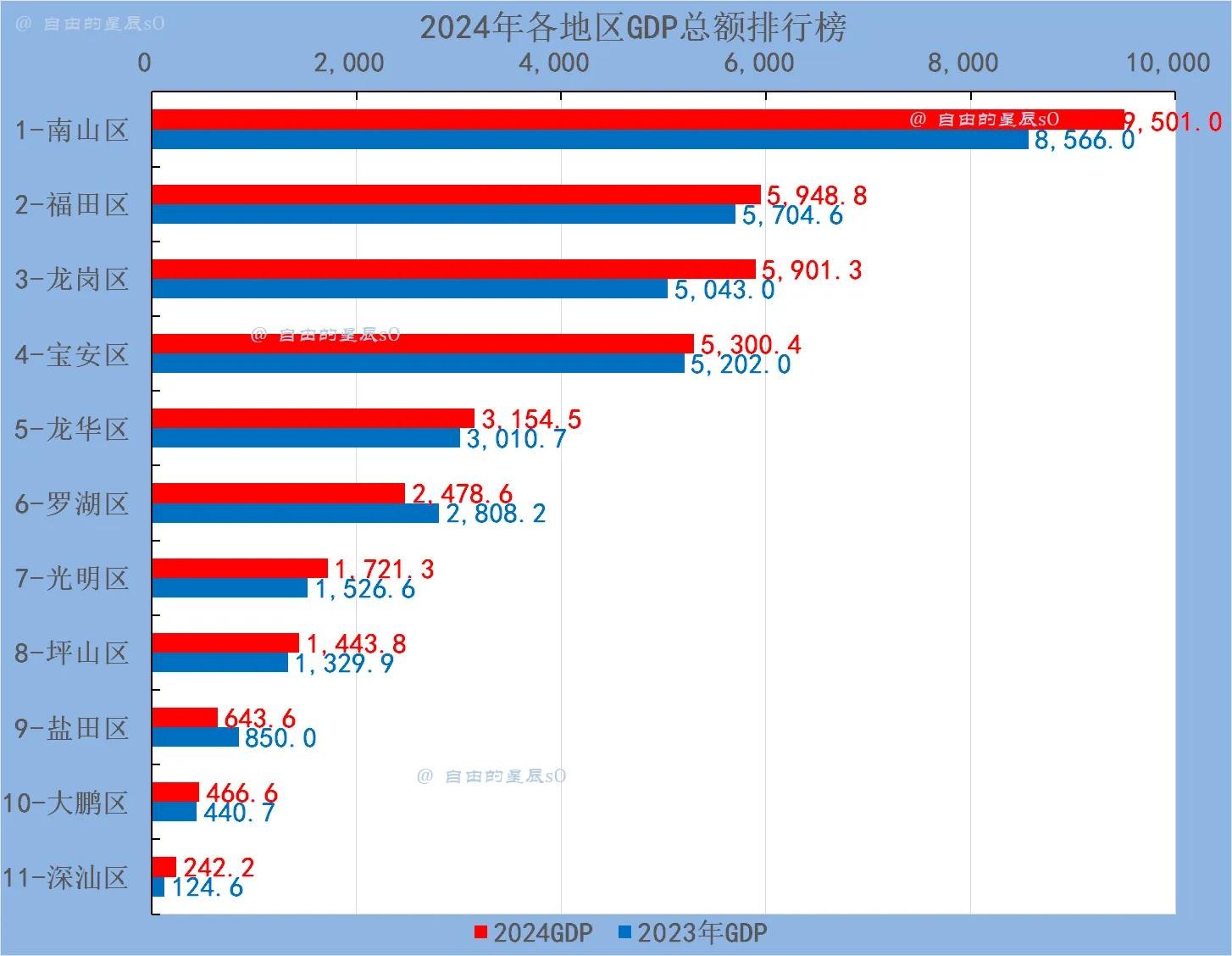 从总量上看:南山大增逼近万亿,3个区5000亿+,3个区不足千亿