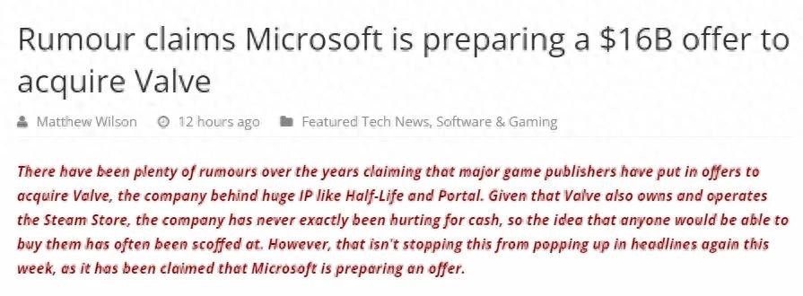 《反恐精英》社区知名创作者Dior爆料称,微软正准备以160亿美元的价格收购Valve,这笔交易可能还涉及Steam平台。