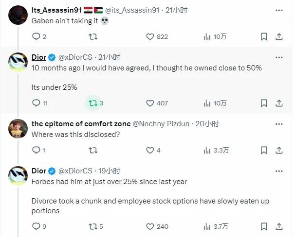 不过爆料者Dior则在后续的推文中表示,自己并不是第一个知道类似消息的人,这些情报早在周一就在当地资本市场流传开来。他补充说公司老板Gabe Newell此前的离婚问题影响了其在公司的股权占比,现在低于25%。此外,他还非常自信地表示美国知名媒体很快就会报道此事。