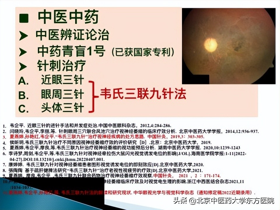 韦企平教授是北京中医药大学东方医院眼科主任医师、教授,首都国医名师第五、第六和第七批全国名老中医学术继承指导老师,世界中医药联合会眼科分会副会长,中国中医药研究促进会眼科分会会长,中国中医药信息学会眼科分会会长,中国中医眼科杂志副主编,新加坡中医师公会及中华医院学术顾问,2007年获得国家科技进步二等奖,2017年中华医学会眼科分会授予“神经眼科杰出贡献奖”,2020年获得中国中医药研究促进会科技进步一等奖,2021年获中华中医药学会学术成果二等奖。擅长治疗多种眼表和眼内疾病,尤其采用中西医结合,针药并举,治疗多种视神经视网膜疾病常有良效。