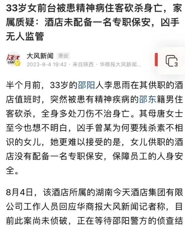 最近,在湖南邵阳发生了一起严重的刑事案件。一名33岁的前台女员工在今天酒店被一名男子持刀砍了50多刀,最终不治身亡。