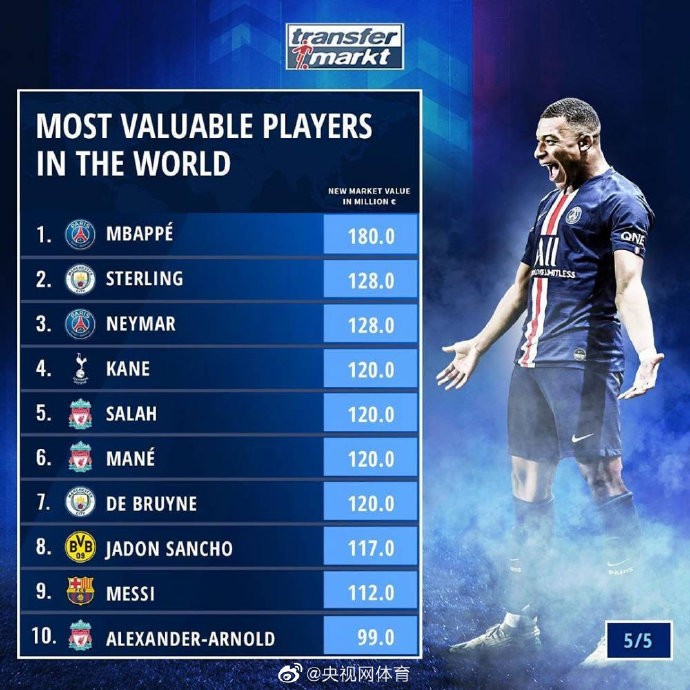 球员身价榜Top50:姆巴佩居首 梅西第九