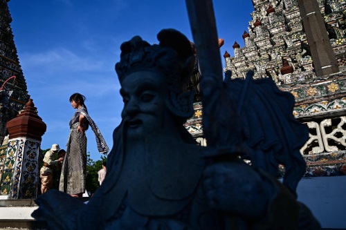 2月12日,游客身穿泰国传统服饰在泰国曼谷郑王庙前留影。 新华社/法新
