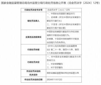 台海网11月26日讯 根据国家金融监督管理总局网站近日发布的行政处罚信息公开表(沧金罚决字〔2024〕12号)显示,因存在贷前调查不尽职违法违规行为,国家金融监督管理总局沧州监管分局对中国农业发展银行献县支行罚款30万元。