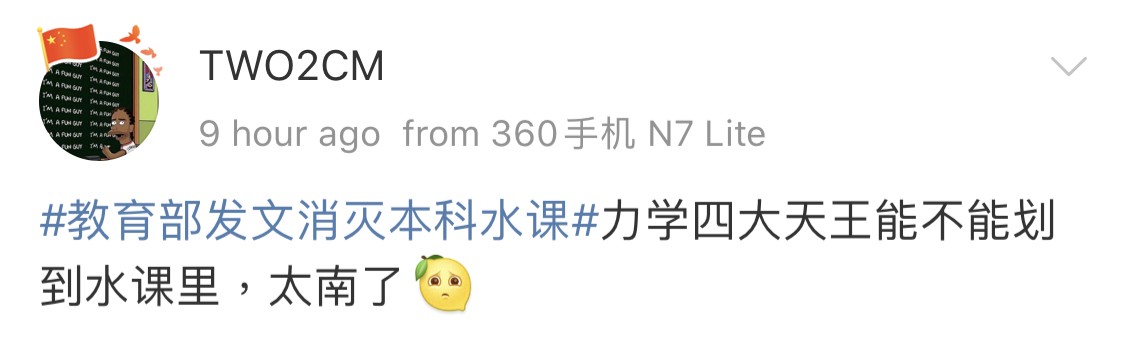 原来是教育部印发了《关于一流本科课程建设的实施意见》,要求立起教授上课、消灭“水课”、取消“清考”等硬规矩。让学生体验“跳一跳才能够得着”的学习挑战。