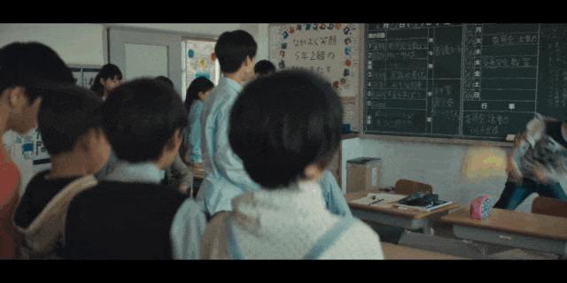 星川和女同学们一起进教室,看到脏兮兮的书桌时,女同学和他一起整理。
