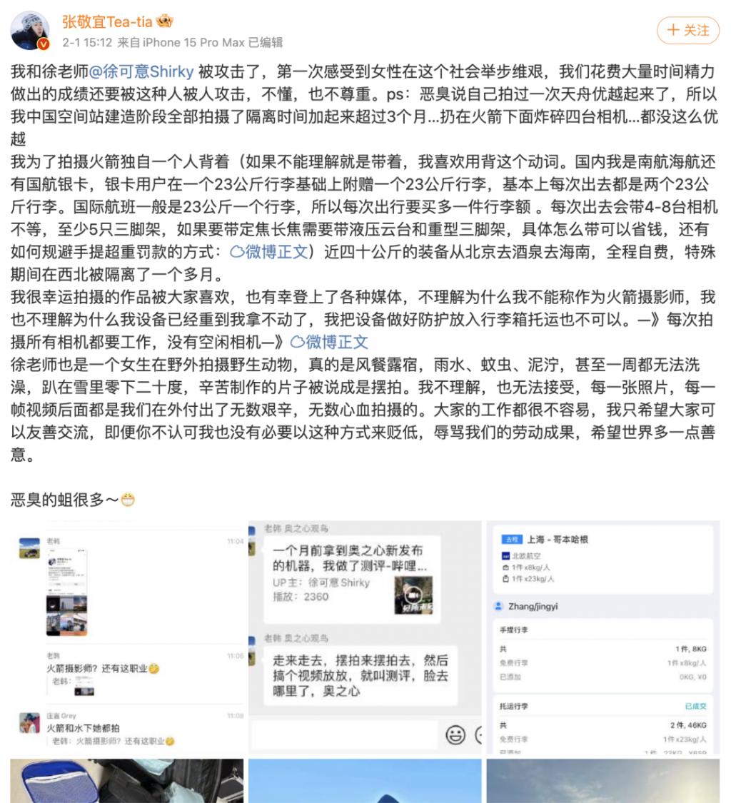 女摄影师张敬宜,拍出了中国火箭发射的超燃瞬间,却遭遇到非常恶劣的网络暴力,仅仅因为这些网络喷子受不了拍中国航空航天此等壮举的竟然是个女人。