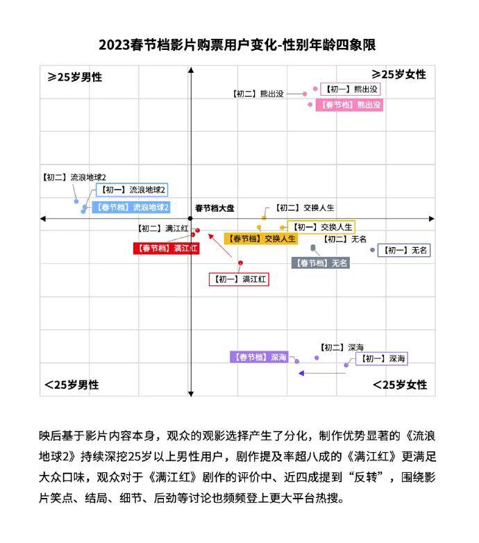 但我知道最直观的体验,去年春节档没有拍给女性的电影,25 岁以上中国女性观众最爱看的春节档是《熊出没》,因为她们负责带娃看。而今年春节档女性观众占比 62.9%,是 2014 年来女性占比最高。