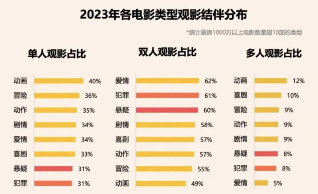 据灯塔研究院《2023 中国电影市场年度盘点报告》,2023 年各电影类型观影结伴分布方面,动画类型单人观影占比与多人观影占比最高,双人观影占比最低。