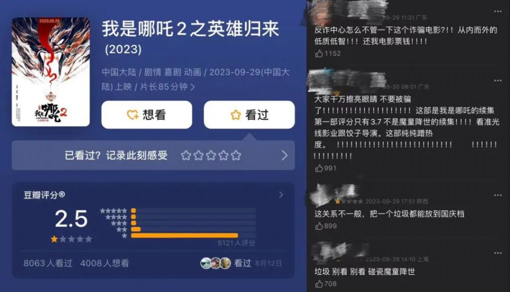 比如,去年《我是哪吒 2 之英雄归来》上映时,曾被观众误以为是蹭《哪吒之魔童降世》的续作,纷纷称其为 " 诈骗电影 "。但这部电影其实是 2016 年上映的《我是哪吒》的续作,对准的目标受众也是儿童,最后迎来口碑与票房双低的局面。