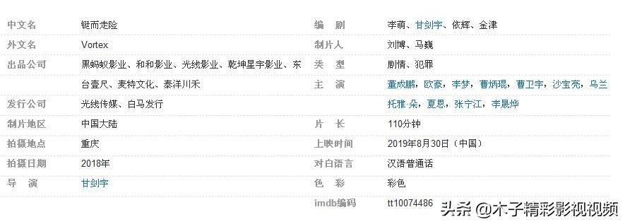 《铤而走险》是由黑蚂蚁(上海)影业有限公司出品的动作犯罪片,由曹保平监制、甘剑宇执导,董成鹏、欧豪、李梦领衔主演。该片于2019年8月30日在中国内地上映。该片讲述了修车工刘小俊因赌博欠债,为了还钱倒卖一辆黑车,意外卷入一起儿童绑架案的故事。