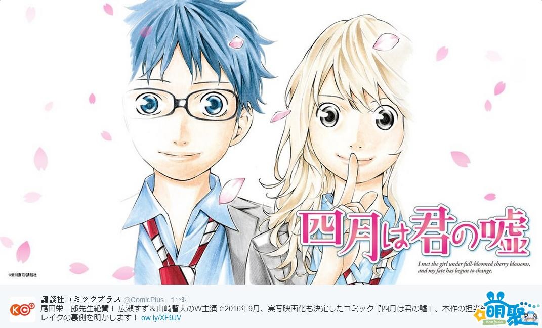 《四月是你的谎言》改编自日本漫画家新川直司绘制的同名漫画作品,此前官方宣布将制作这部作品的真人版电影,预计2016年上映。今日正式确认本作将于今年9月上映!故事讲述了拥有少见才能的有马公生(钢琴家)和宫园薰(小提琴家)共同努力、成长的青春物语。