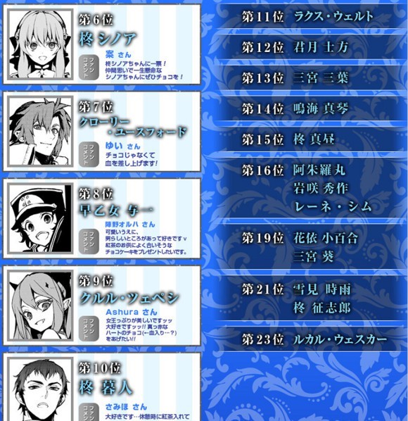《终结的炽天使》白色情人节人气投票结果公布