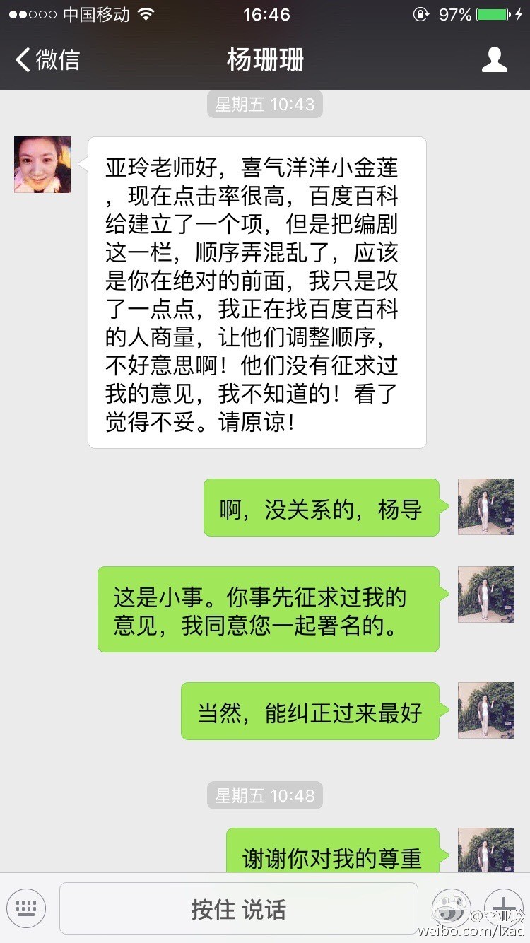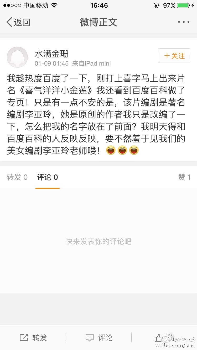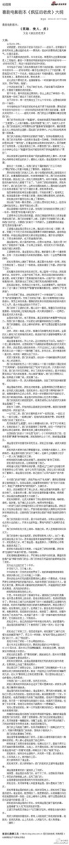 关于我的网络电影《喜气洋洋小金莲》署名一事的声明:这是我2008年转型做编剧写的第一个剧本处女作。从构思到完稿一共三天,原名《疯狂的老虎》,最早投稿给吴天明导演,吴导看后很喜欢,但因涉及批判现实未能通过审查。投资方在支付了66.8万稿酬以后由杨珊珊导演拍成了网络电影。附我当年的剧本大纲。