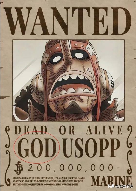 当然部分名声极大的海贼,由于其匪号比真名更有识别度,于是就一起加到了悬赏令上。但乌索普这个“GOD”的绰号,是海军专门给取的,其中包含两层意思。