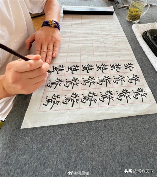 何晟铭写毛笔字。图/微博@何晟铭