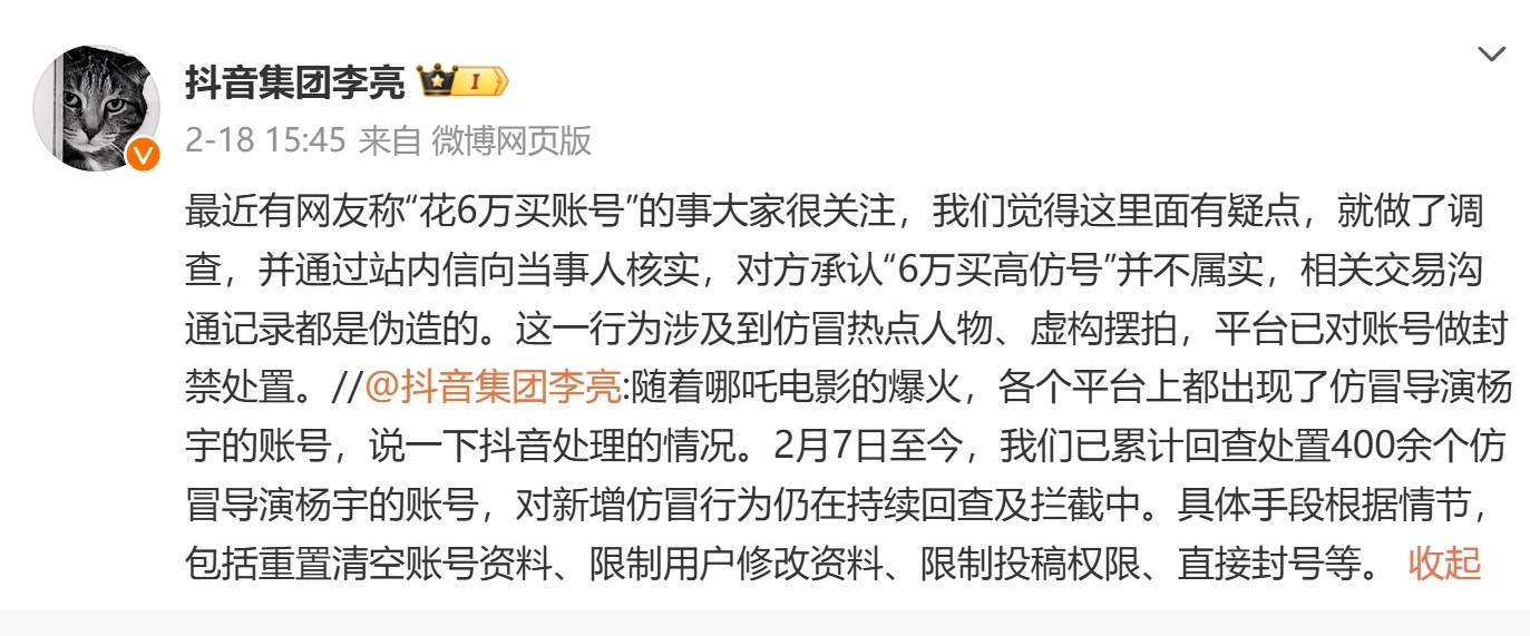 抖音集团副总裁李亮回应“高仿”账号事件截图