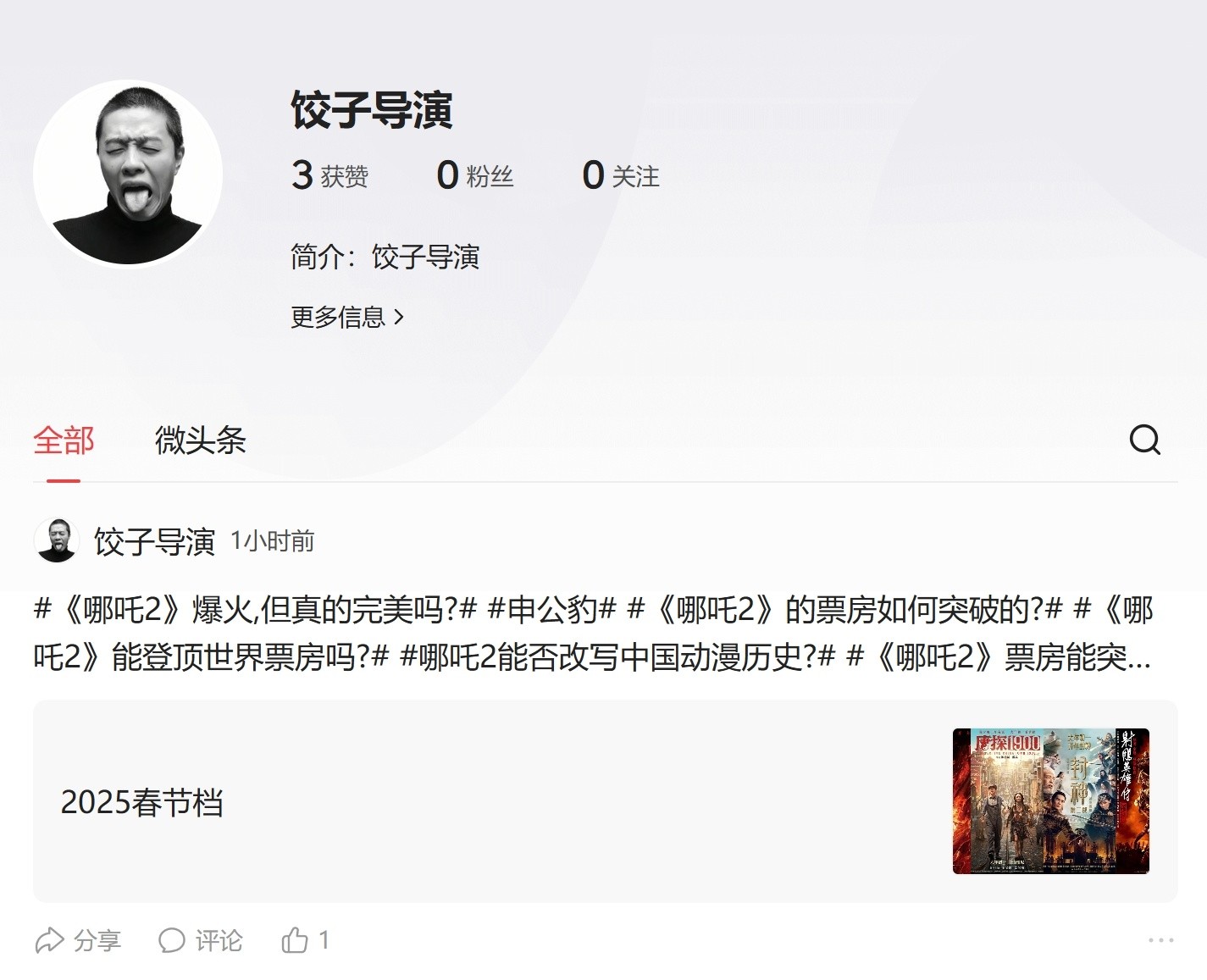 截至目前,《哪吒2》片方工作人员对外界表示,“饺子”导演只注册了微博账号,其他平台账号均为假冒。