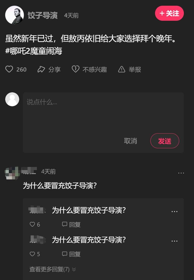 在一家竖屏短视频平台,同样关键词,搜索结果第一页发现有仿冒“饺子”导演的账号。有网友在其评论区集体留言指责“为什么要冒充饺子导演?”。
