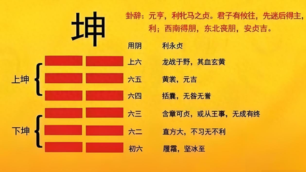 其卦辞为:坤,元亨,利匹马之贞。君子有攸往,先迷后得主,利西南得朋,东北丧朋友。安贞吉。
