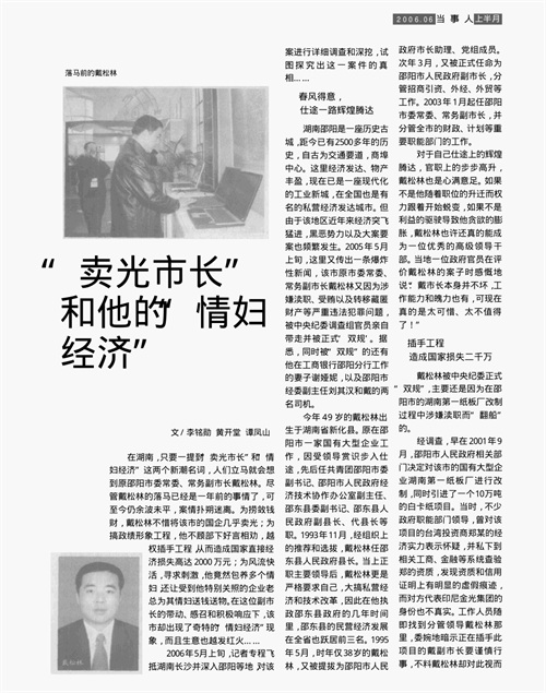 2006年2月,《知音》(海外版)第3期发表了题目为《明星市长情网惊梦,印尼情人狂卷千万》的文章,作者署名为“念父”。该文报道的是湖南省邵阳市原副市长戴松林,涉嫌渎职、受贿、包养情妇等违法犯罪事实。文章配发了主人公照片,并在照片边标写了“昔日风光无限的戴松林”字样。